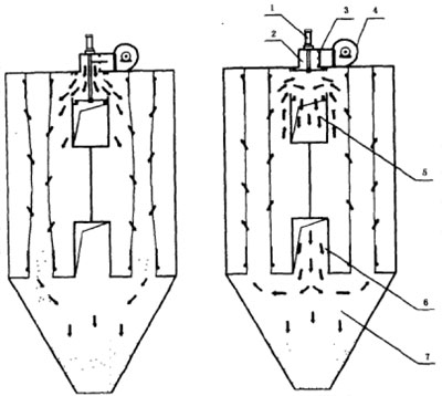 其它型號烘干機(jī)袋式除塵器采用上部進(jìn)氣方式,如圖所示,粉塵均由濾袋內(nèi)部自上而下通過,然后落入灰斗。粉塵對濾袋的磨損較為嚴(yán)重。