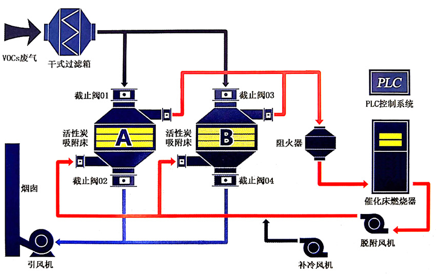 活性炭吸附+催化燃燒脫附裝置,是采用催化燃燒活性炭脫附,將大風量低濃度的有機溶劑吸附到活性炭中,經(jīng)催化燃燒將含溶劑活性炭加熱到沸點,通過催化劑的氧化燃燒反應,將炭中物質轉化為無害的水和二氧化碳排入大氣,并且能解決活性炭脫附的二次污染。如果VOCs廢氣濃度低于1000g/m,出口溫度低于45℃,其性質屬于低濃度廢氣,因此選擇活性炭吸附-催化燃燒脫附較為理想。