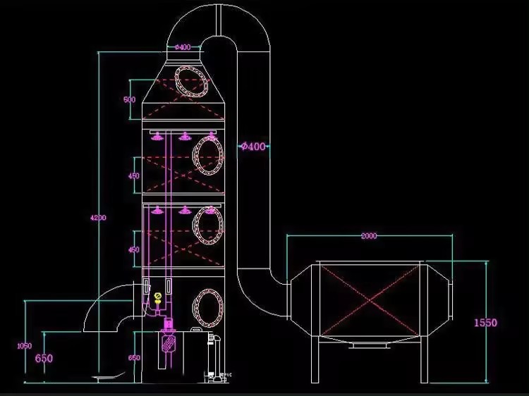 廢氣由風機引入噴淋塔,內筒形成壓力室,壓力室均勻分布到每個鼓泡管。廢氣通過鼓泡管,進入液體吸收罐吸收鼓泡液體,然后氣泡通過填料層。氣-液兩相與吸收中和反應完全接觸。水經塔底的水泵加壓后噴在塔頂,最后返回塔底回收,并且吸收和過濾后的廢氣繼續向上流動并被噴射。管子噴出的吸收中和液產生最終反應。中和反應后,末端除霧板脫水除塵后的氣體排入大氣,它也可以與光氧催化或低溫等離子體和活性炭氣體凈化設備結合使用。處理后廢氣達到地方或國家排放標準和排放要求